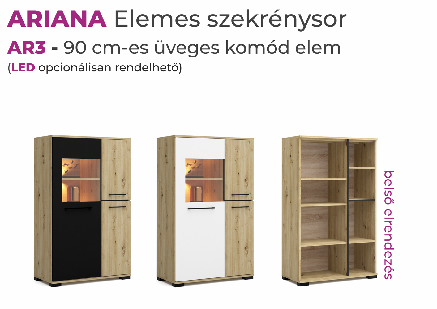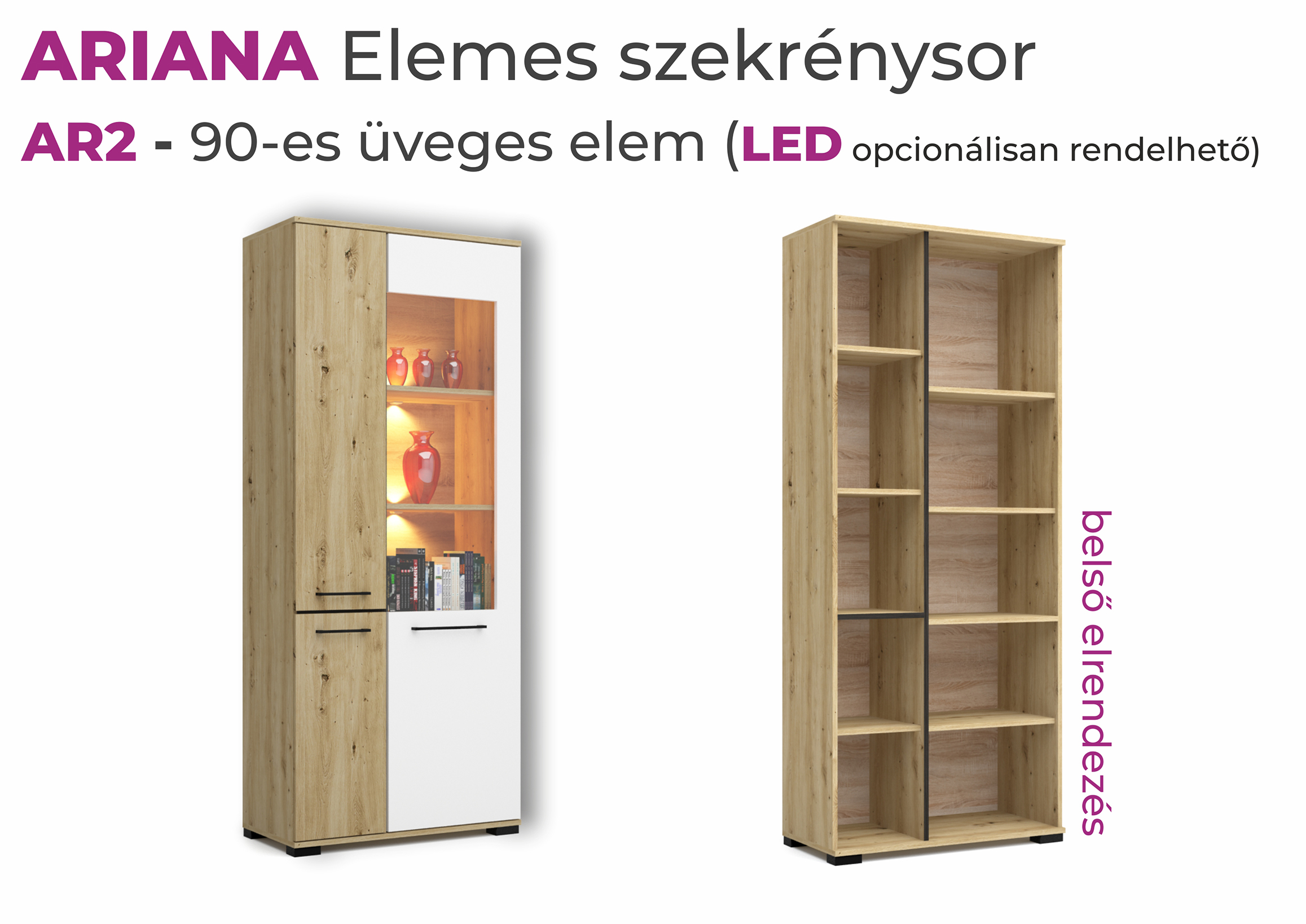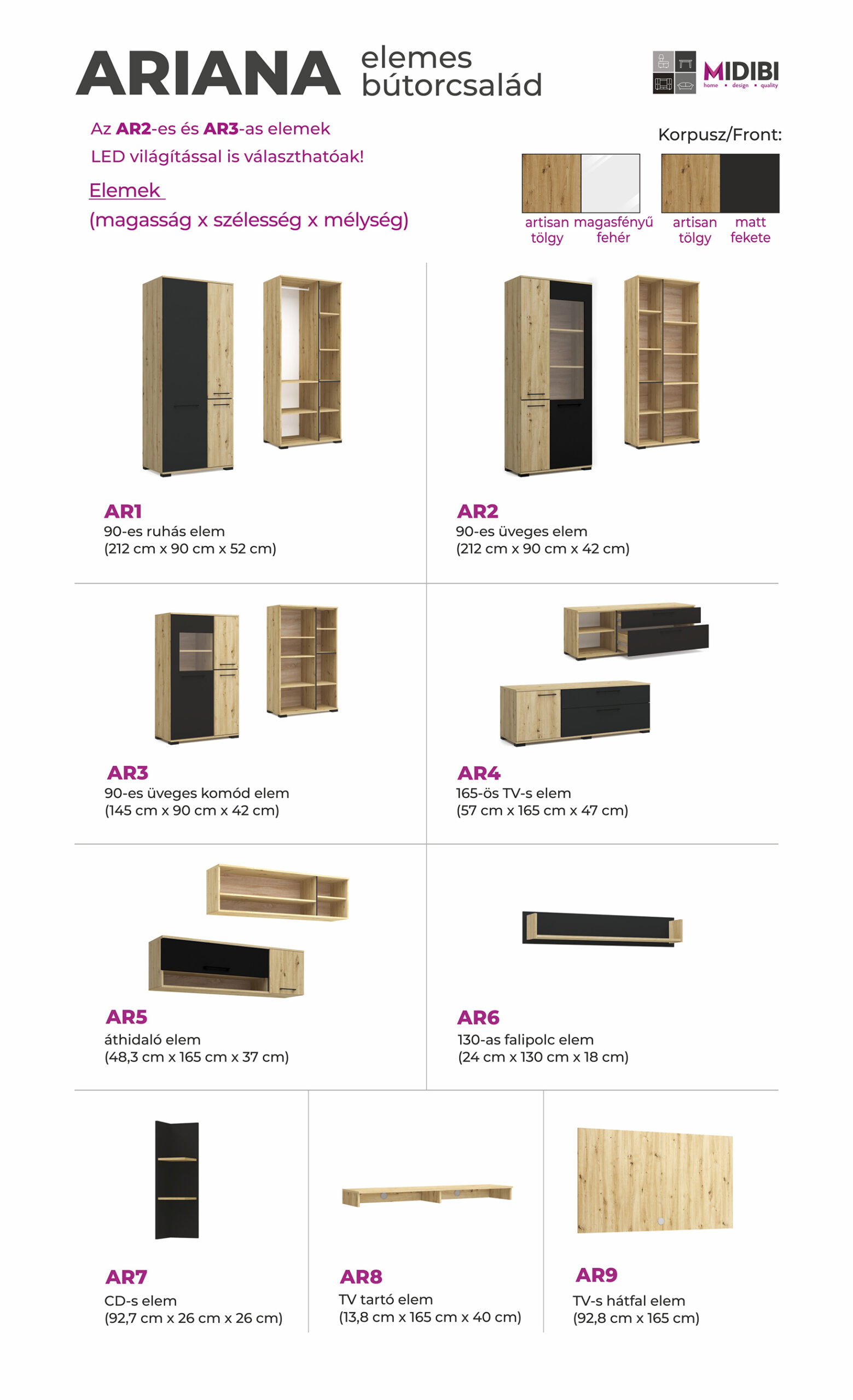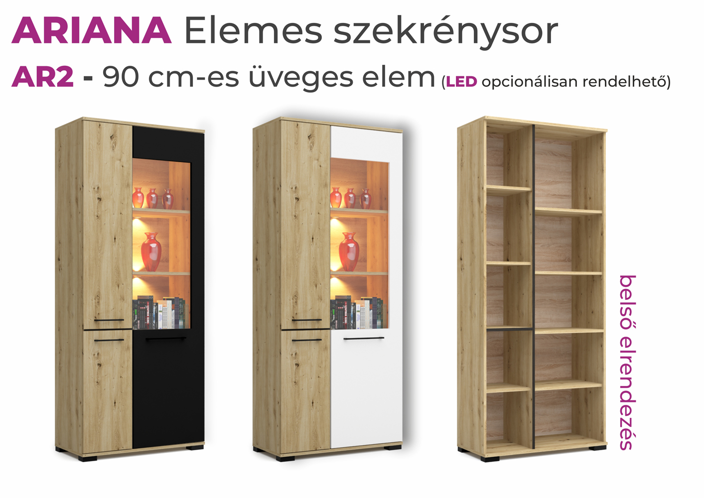 Az Ariana szekrénysor artisan tölgy – magasfényű fehér vagy artisan tölgy – matt fekete színkombinációban kapható. Tetszés szerint akár további elemekkel is kiegészíthető, vagy Ariana elemeket rendelve saját igényeink szerint állítható össze szekrénysorunk. Az üveges elemekbe opcionálisan LED világítás is kérhető, ez plusz költség.