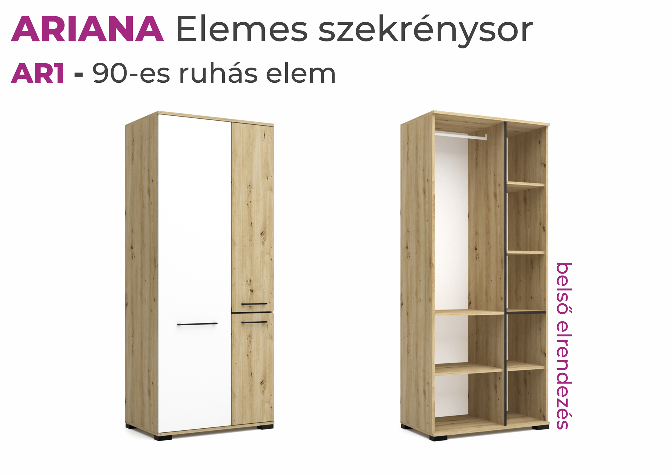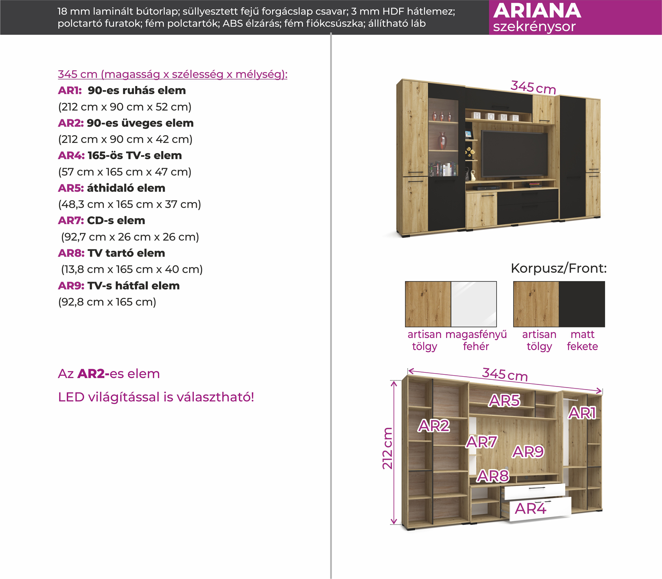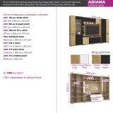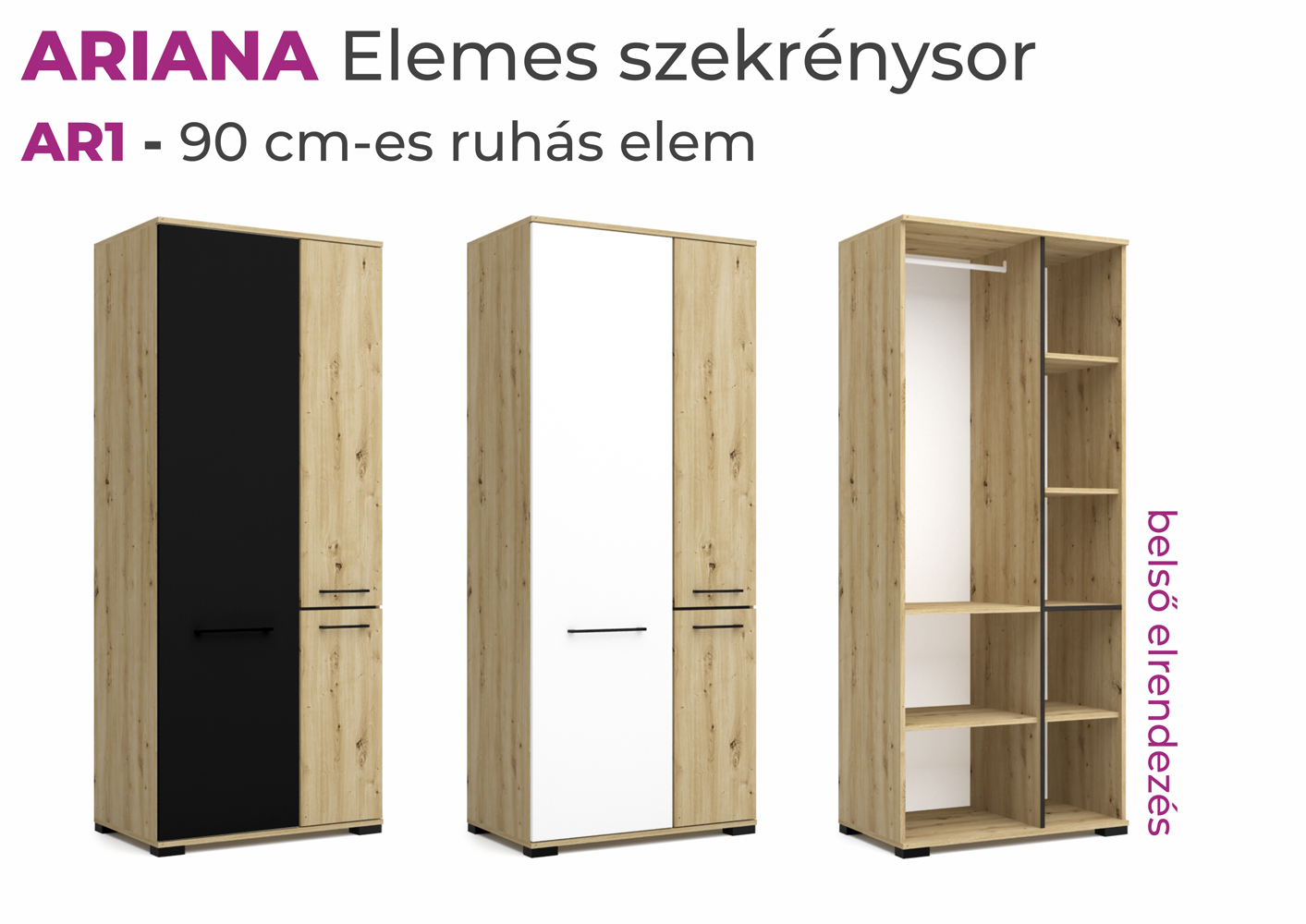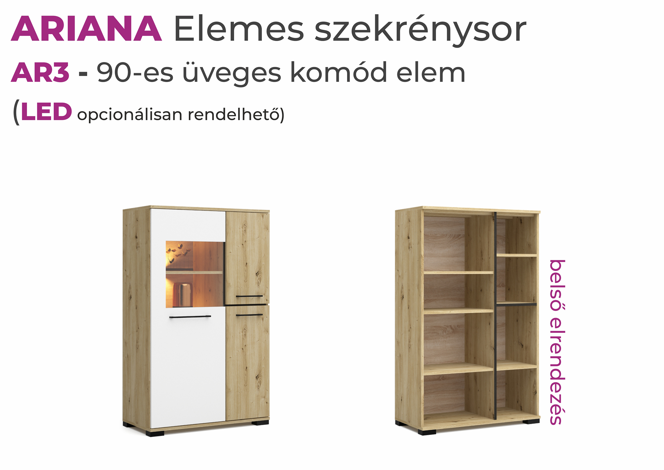 Az Ariana szekrénysor artisan tölgy – magasfényű fehér vagy artisan tölgy – matt fekete színkombinációban kapható. Tetszés szerint akár további elemekkel is kiegészíthető, vagy Ariana elemeket rendelve saját igényeink szerint állítható össze szekrénysorunk. Az üveges elemekbe opcionálisan LED világítás is kérhető, ez plusz költség.