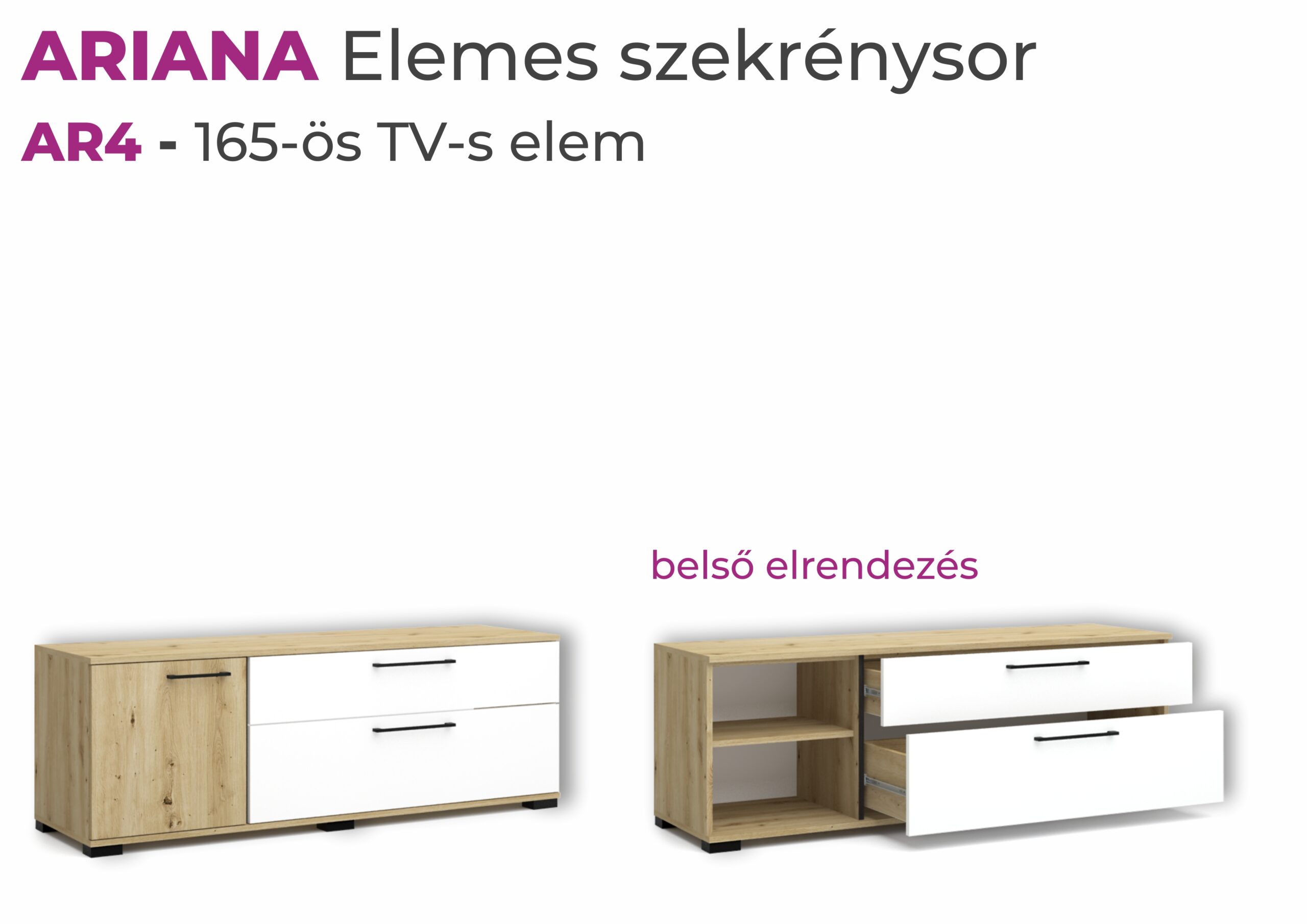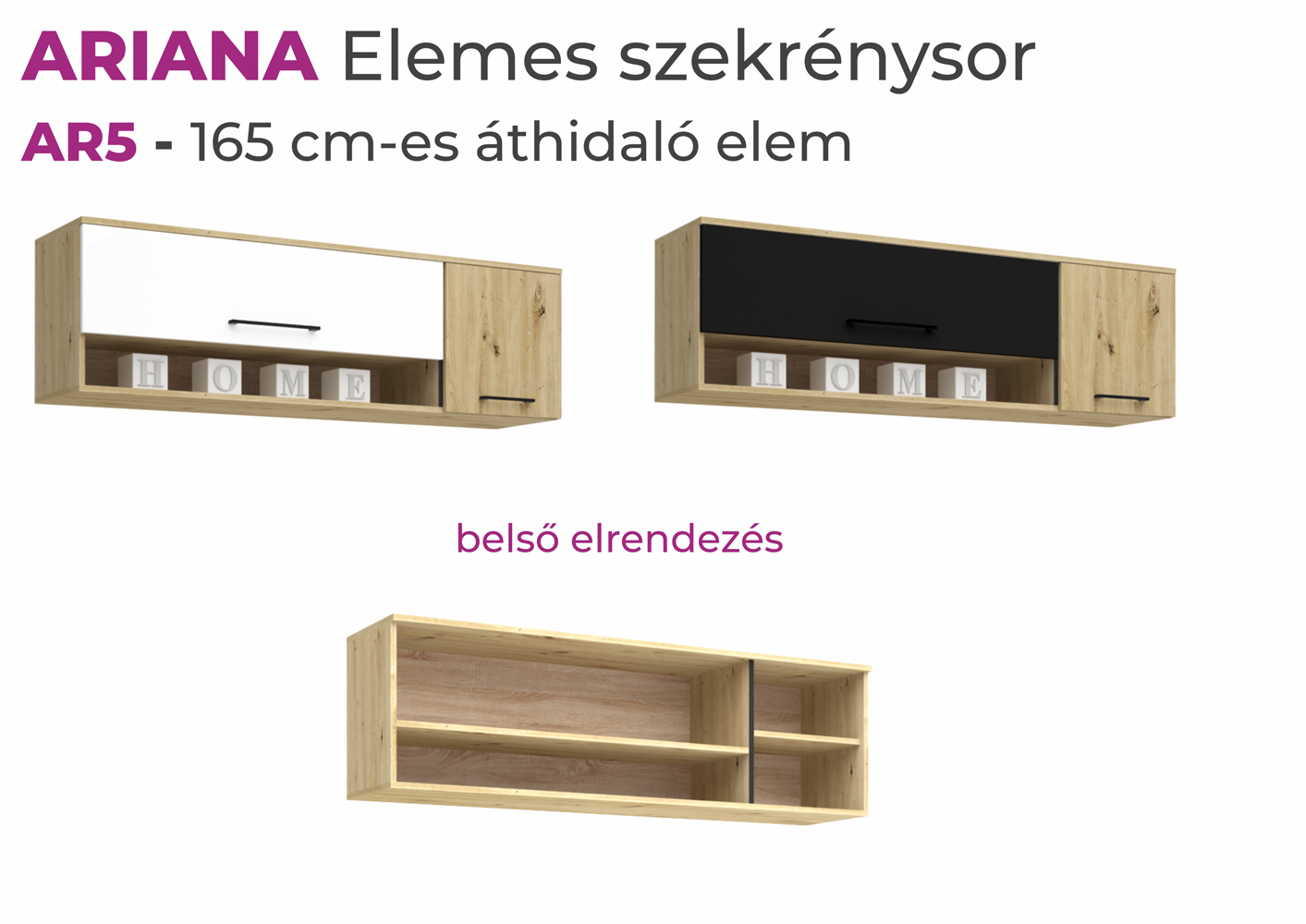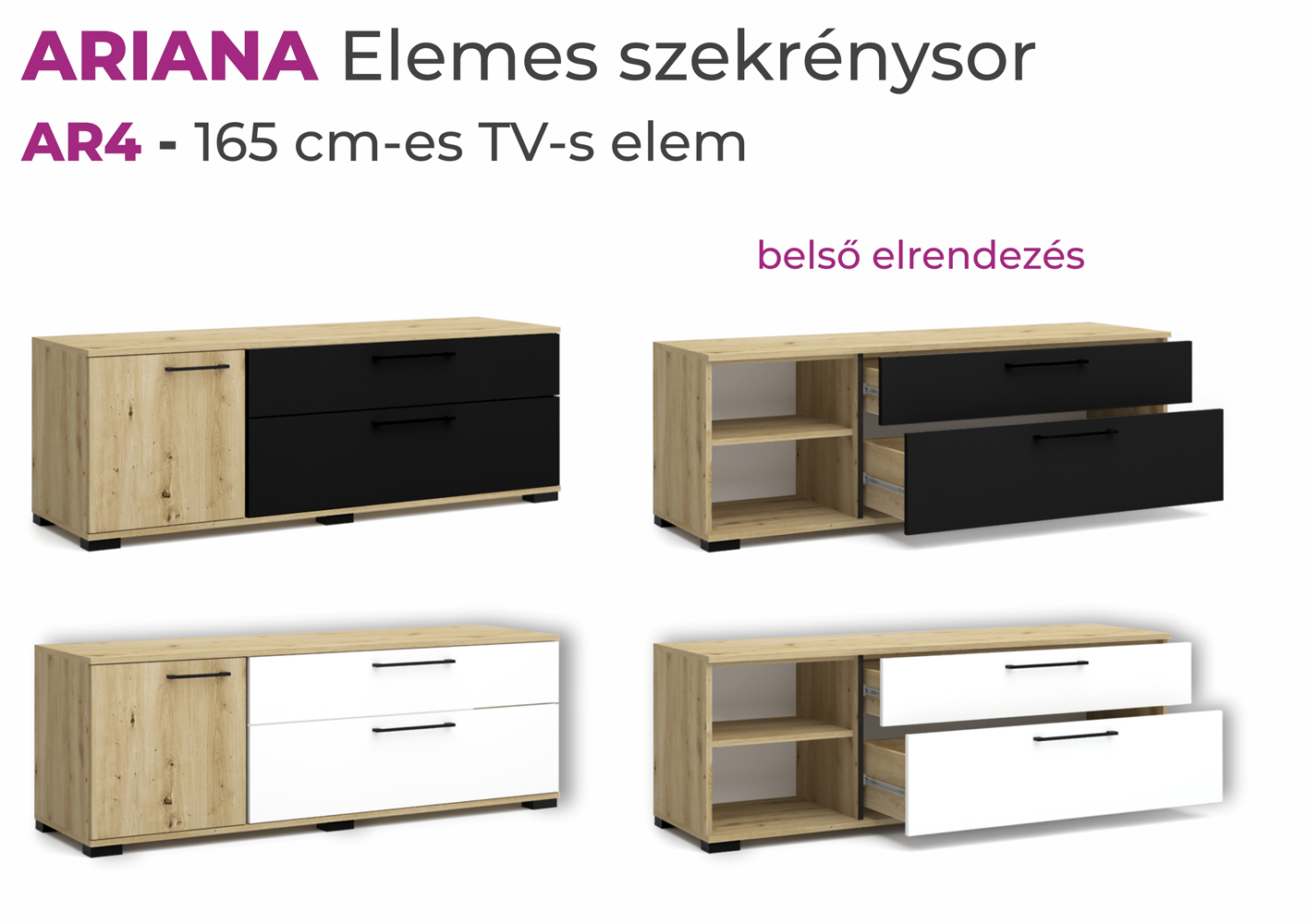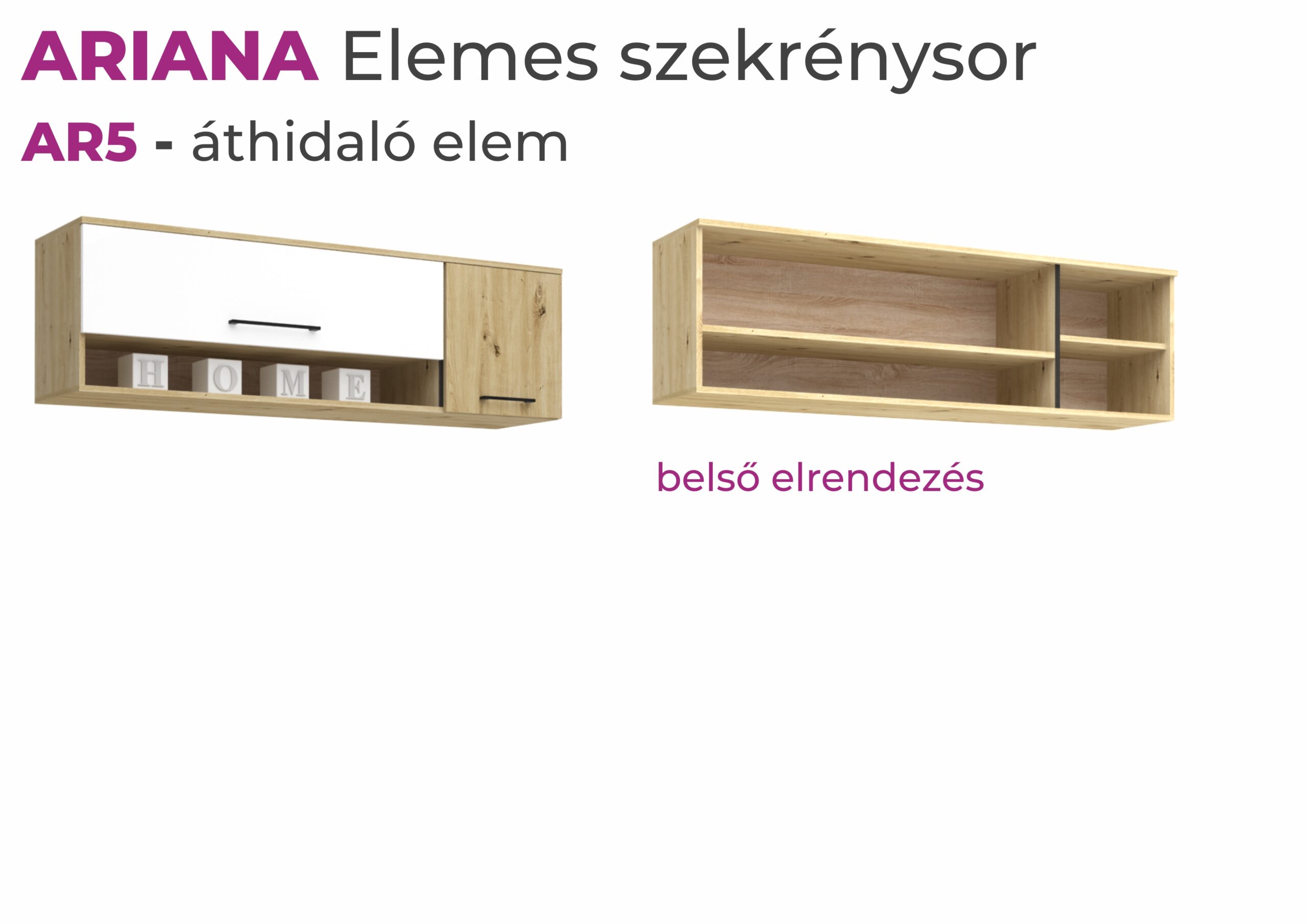 Az Ariana szekrénysor artisan tölgy – magasfényű fehér vagy artisan tölgy – matt fekete színkombinációban kapható. Tetszés szerint akár további elemekkel is kiegészíthető, vagy Ariana elemeket rendelve saját igényeink szerint állítható össze szekrénysorunk. Az üveges elemekbe opcionálisan LED világítás is kérhető, ez plusz költség.