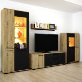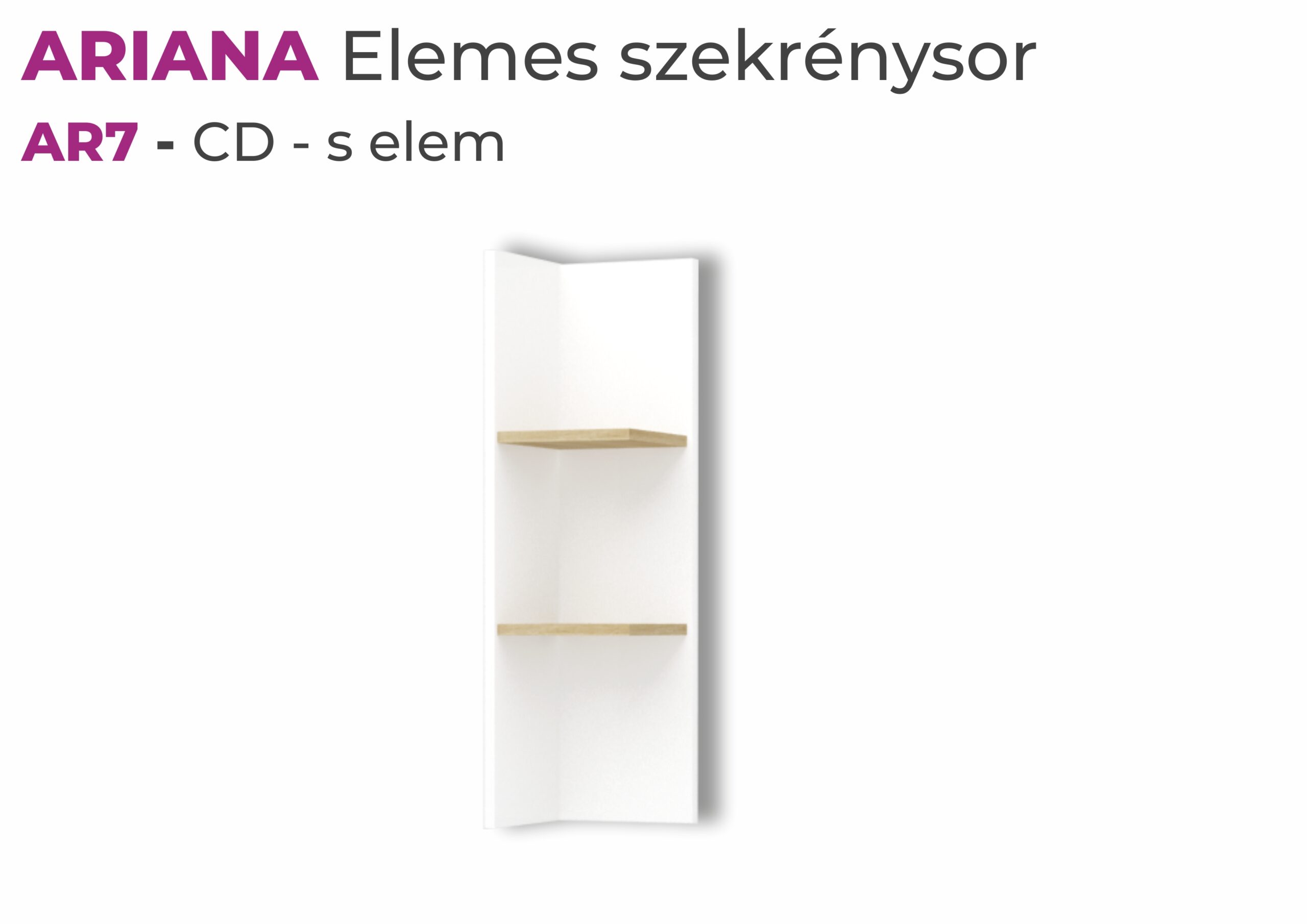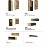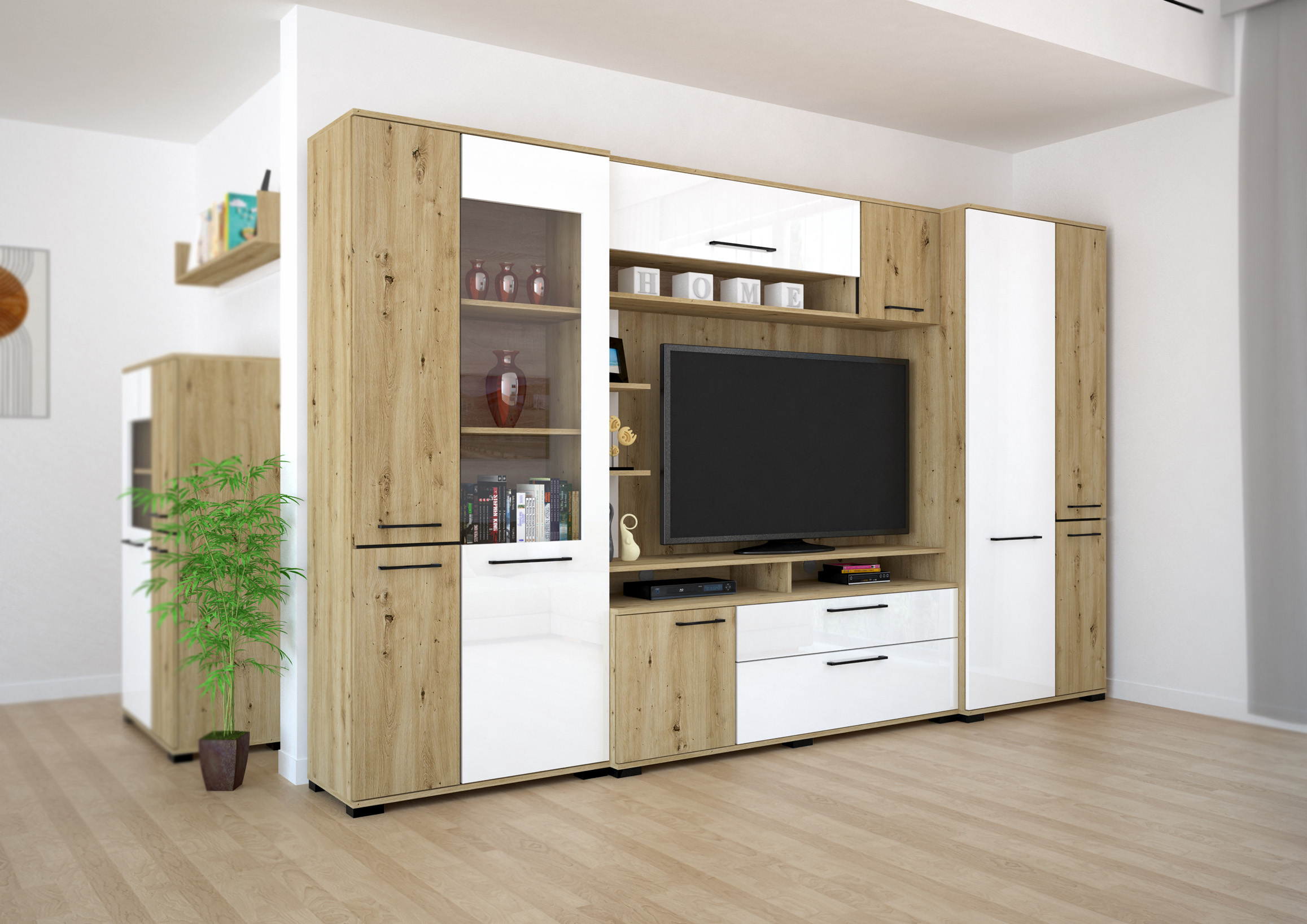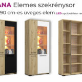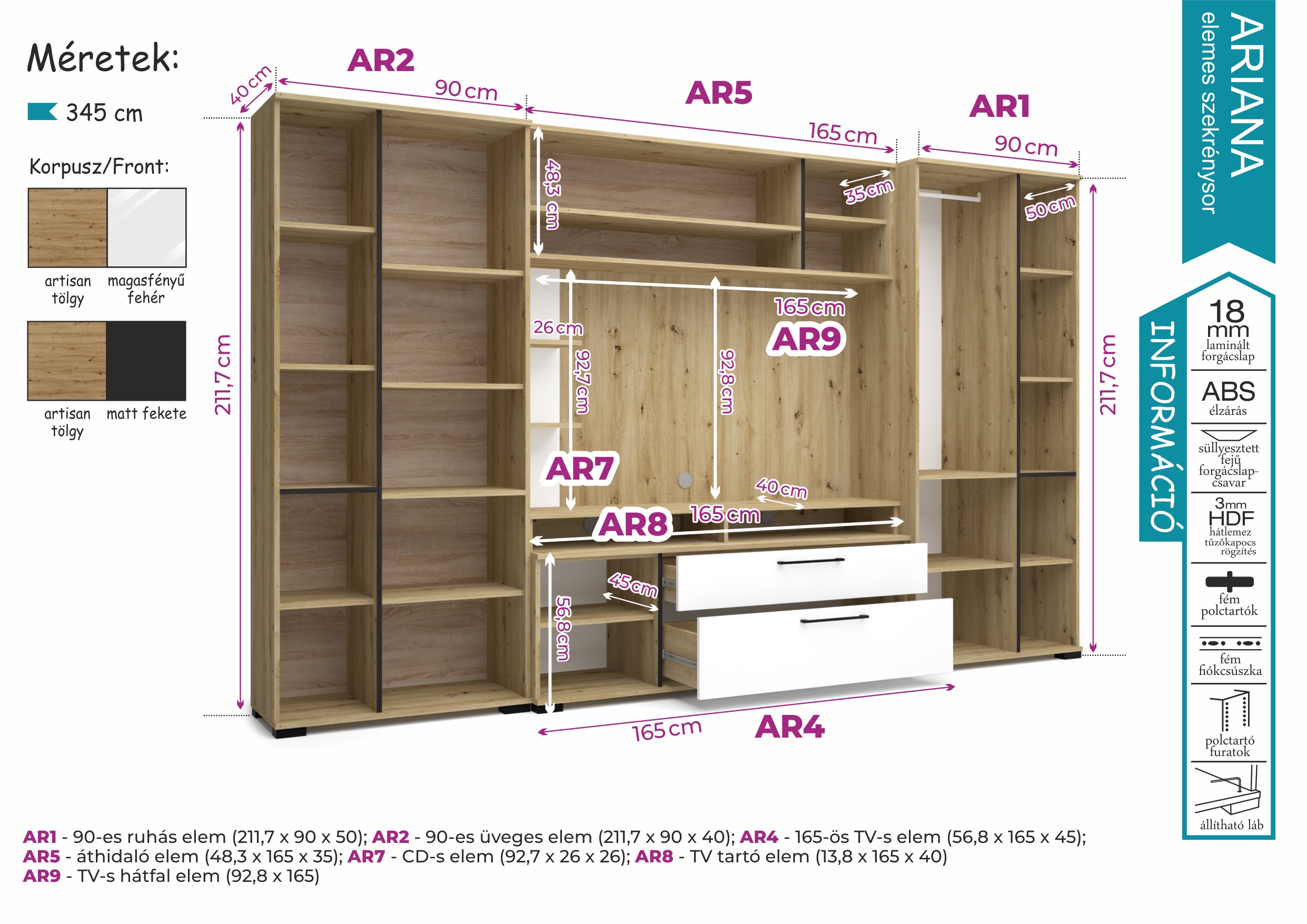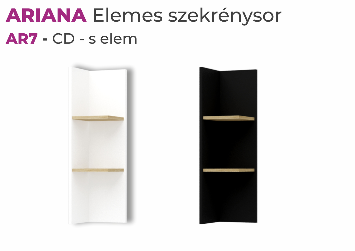 Az Ariana szekrénysor artisan tölgy – magasfényű fehér vagy artisan tölgy – matt fekete színkombinációban kapható. Tetszés szerint akár további elemekkel is kiegészíthető, vagy Ariana elemeket rendelve saját igényeink szerint állítható össze szekrénysorunk. Az üveges elemekbe opcionálisan LED világítás is kérhető, ez plusz költség.