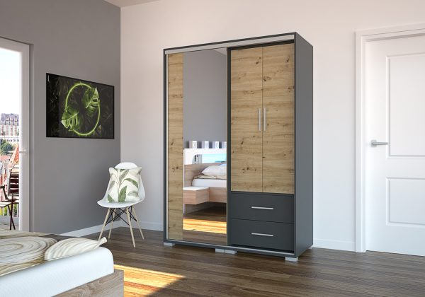 A 140 cm-es Arizona gardrób egy 70 cm-es ruhás részből és egy 70 cm-es polcos-fiókos részből áll. A gardrób különlegessége, hogy a ruhás részt tükrös tolóajtó rejti el, míg a polcos rész nyílóajtós. A termékhez rendelhető még alsó fiókos, vagy felső tolóajtós magasító illetve plusz polc is. Ez természetesen plusz költséget jelent.