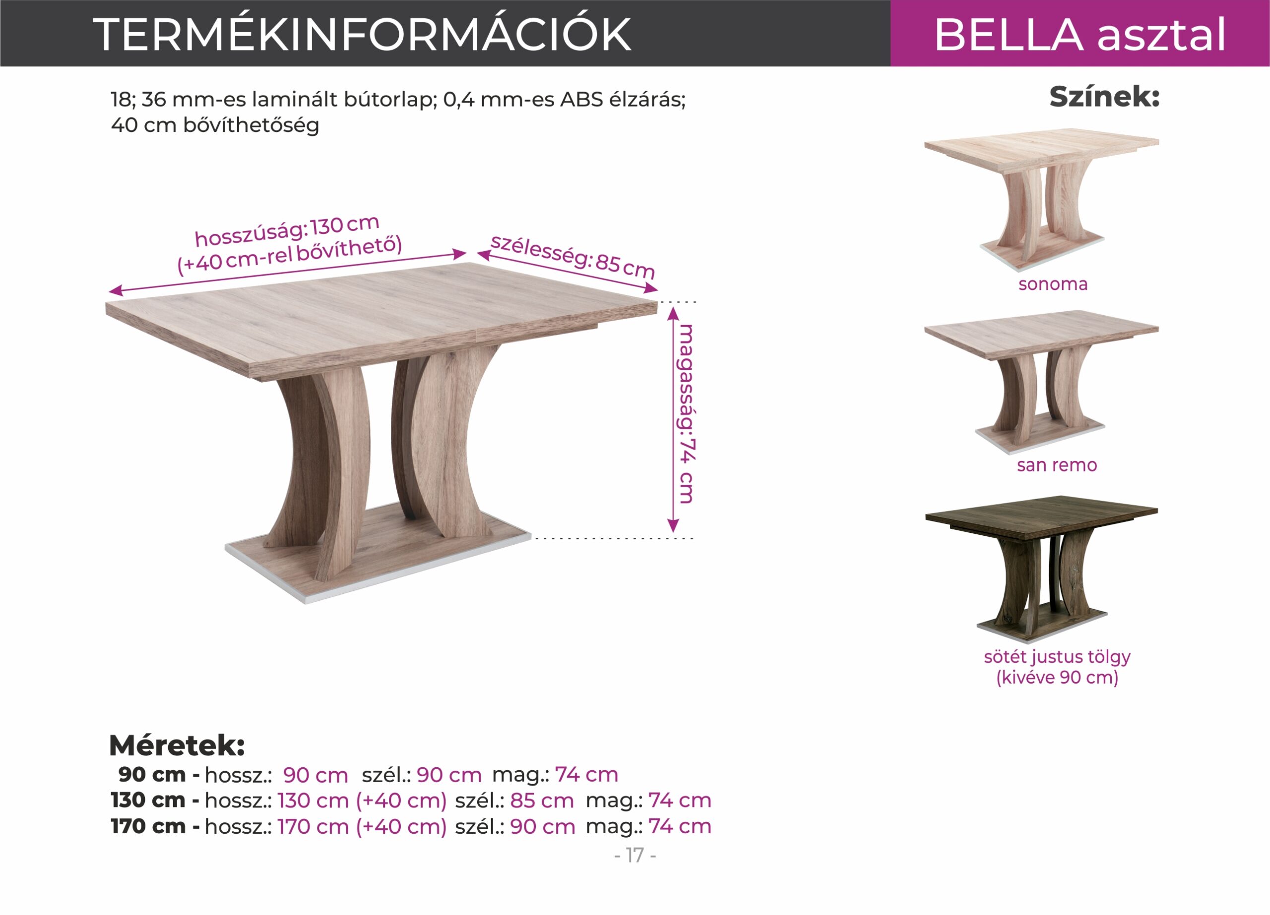 Ha nem csak egy asztalt szeretne a konyhájába, de egy igazán stílusos bútordarabot is egyben, akkor a Bella asztal lehet a tökéletes választás. A letisztult formavilágú asztallapot nagyszerűen egészítik ki az ívelt lábak. 3 méretben kapható (90×90 cm; 130×85 cm; 170×90 cm), sonoma és san remo színekben, valamint sötét justus tölgy színben 130-as és 170-es méretben, így biztosan Ön is találhat az étkezőjébe megfelelőt.