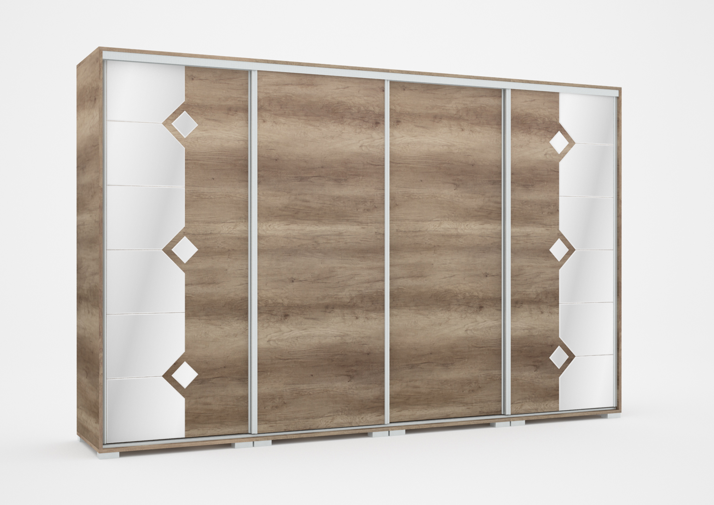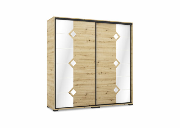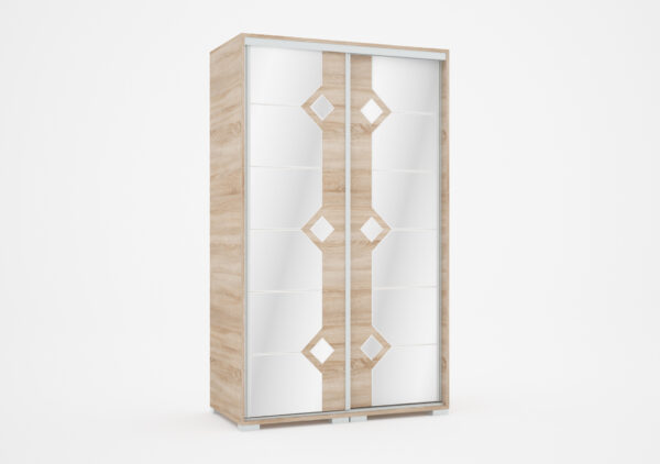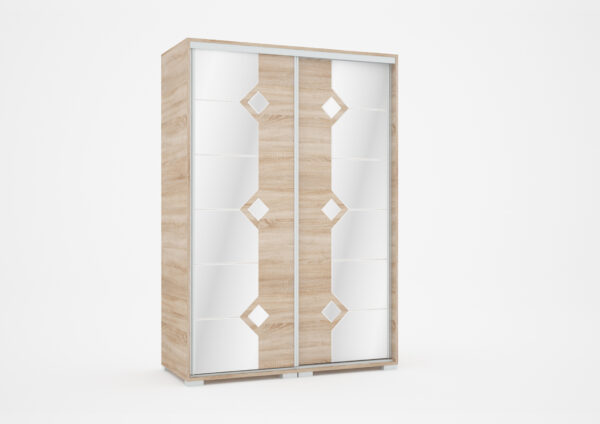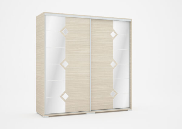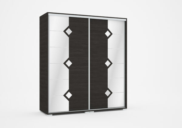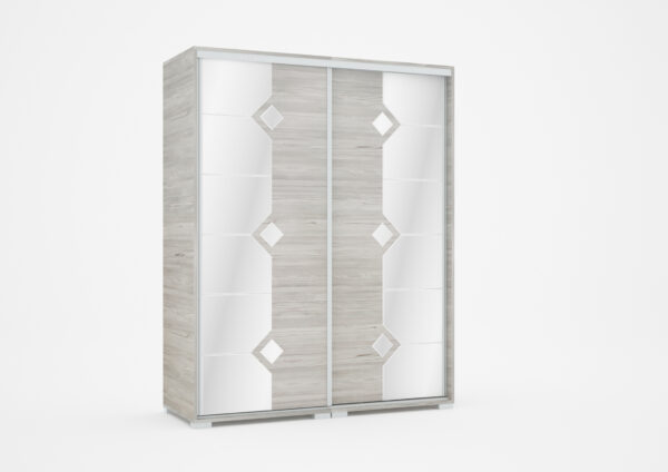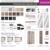 Diamond gardróbunk igazi „ékszer” lehet a hálószobájában. 7 méretben és 18 színben kapható. Külsejét tekintve egy nagyon fiatalos, nőies, elegáns gardrób. Az ajtón található szögletesen vágott tükrök jellegzetes karakteres megjelenést adnak a gardróbnak. Opcionálisan választható termékek: – sarokpolc – tolóajtós sarokelem – fózolt tükör – tükör – fiókos alsó magasító – tolóajtós felső magasító.