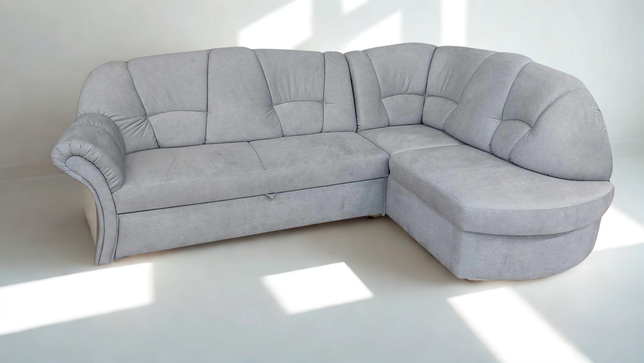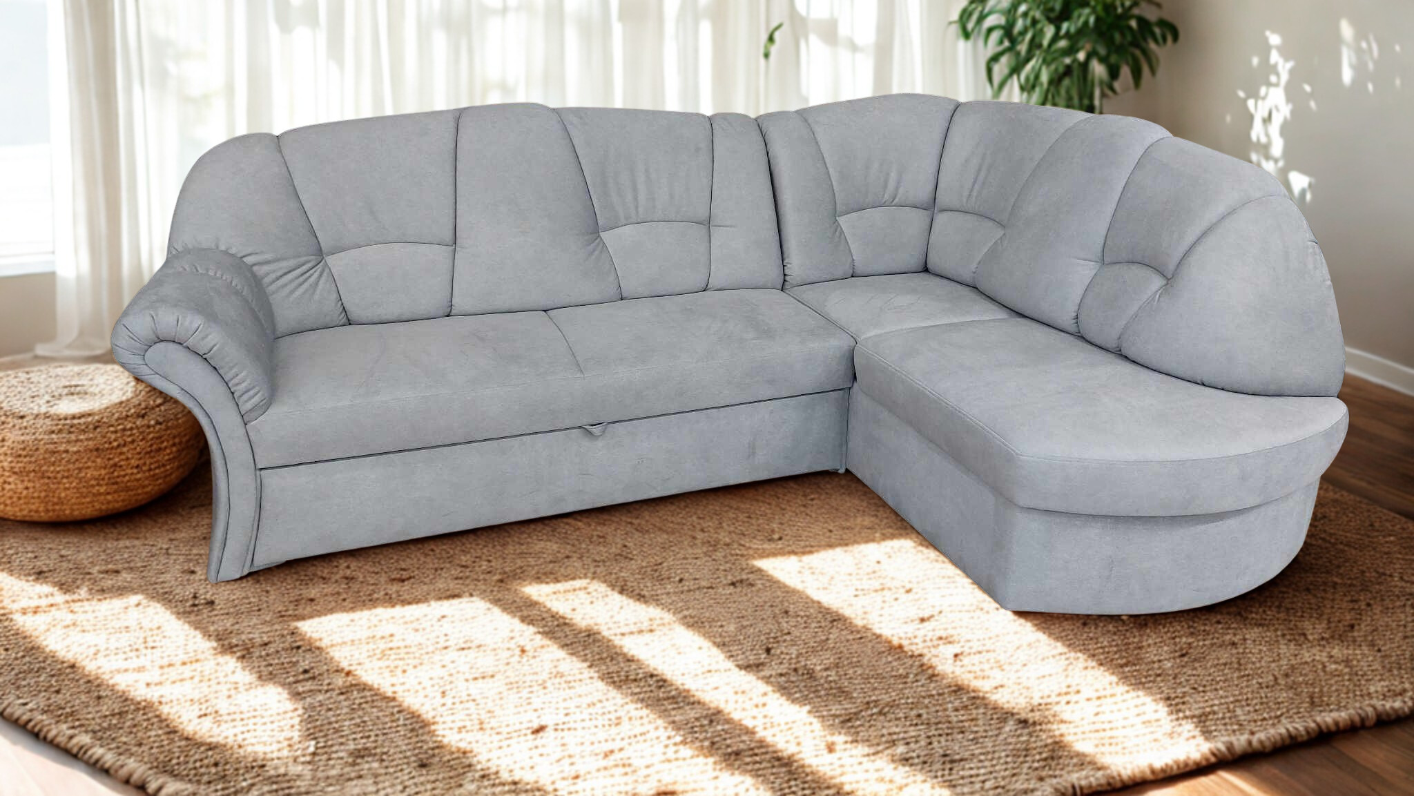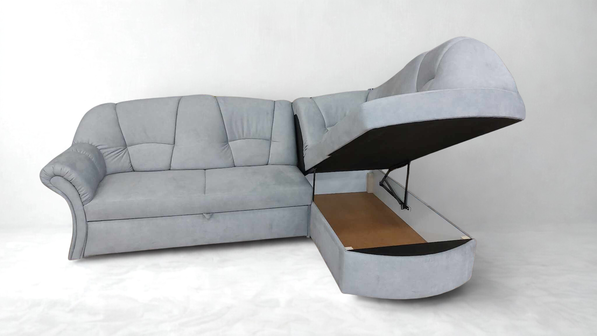 Kisebb méretű sarokgarnitúra , mely vendégággyal és ágyneműtartóval rendelkezik.