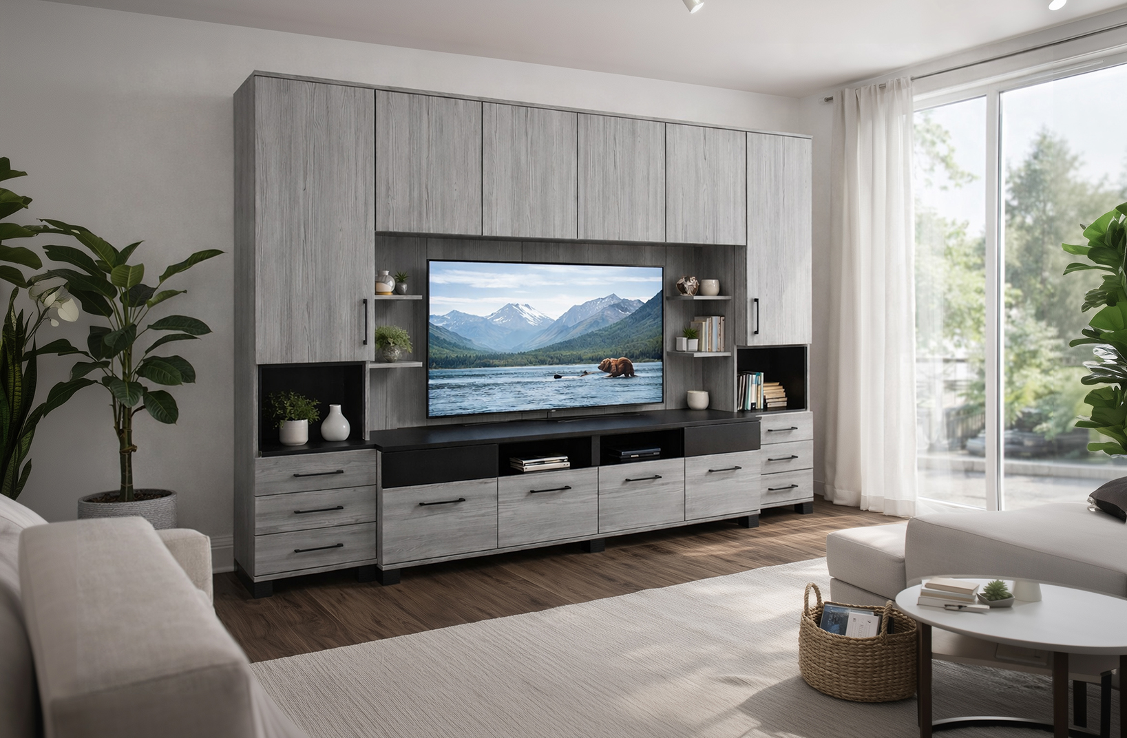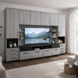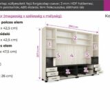 Modern nappali szekrénysor praktikus tárolóhelyekkel, fiókokkal és polcokkal. A letisztult design könnyen illeszkedik a mai lakberendezési stílusokhoz.