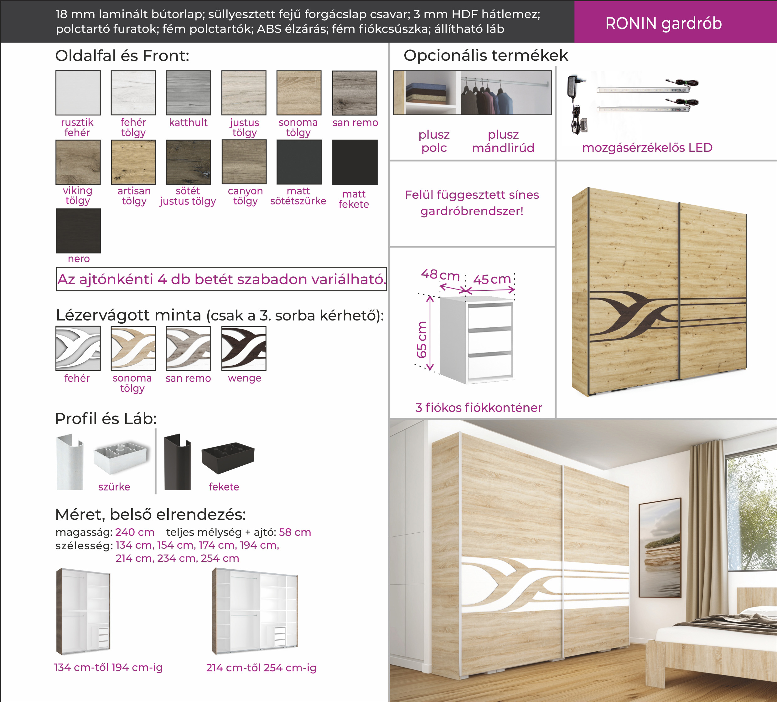 Elegáns külső, praktikus belső elrendezés! A Ronin gardrób ajtói 4-4 panelből állnak, melyek színei szabadon választhatóak. Mind a panelek, mind az oldalfal 13-féle színben kérhető, így a legkülönfélébb színvariációk állíthatóak össze. Gardróbunk különlegessége a front 3. sorára kerülő lézervágott minta, amely 4 színben érhető el. Ezen felül lehetőség van szürke vagy fekete profillal/lábbal kérni a terméket. A 240 cm-es magasságnak és a 7-féle szélességnek köszönhetően remek választás a kisebb szobával rendelkezőknek és a nagy tárolóhelyre vágyók számára egyaránt. A Ronin remek választás, ha teljesen személyre szeretnénk szabni gardróbunk megjelenését és belső elrendezését.