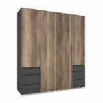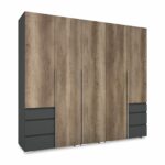 A matt sötétszürke korpuszhoz remekül illik a canyon tölgy, valamint rusztik fehér ajtó.  Mándlirudas, fiókos elrendezésének