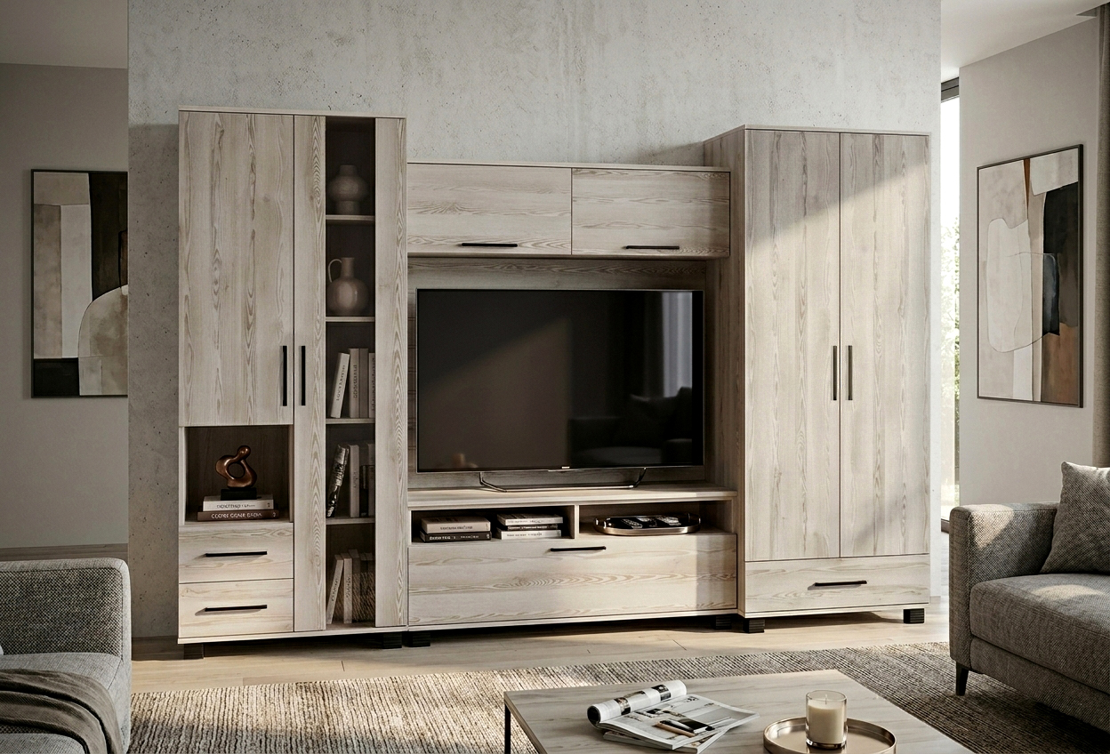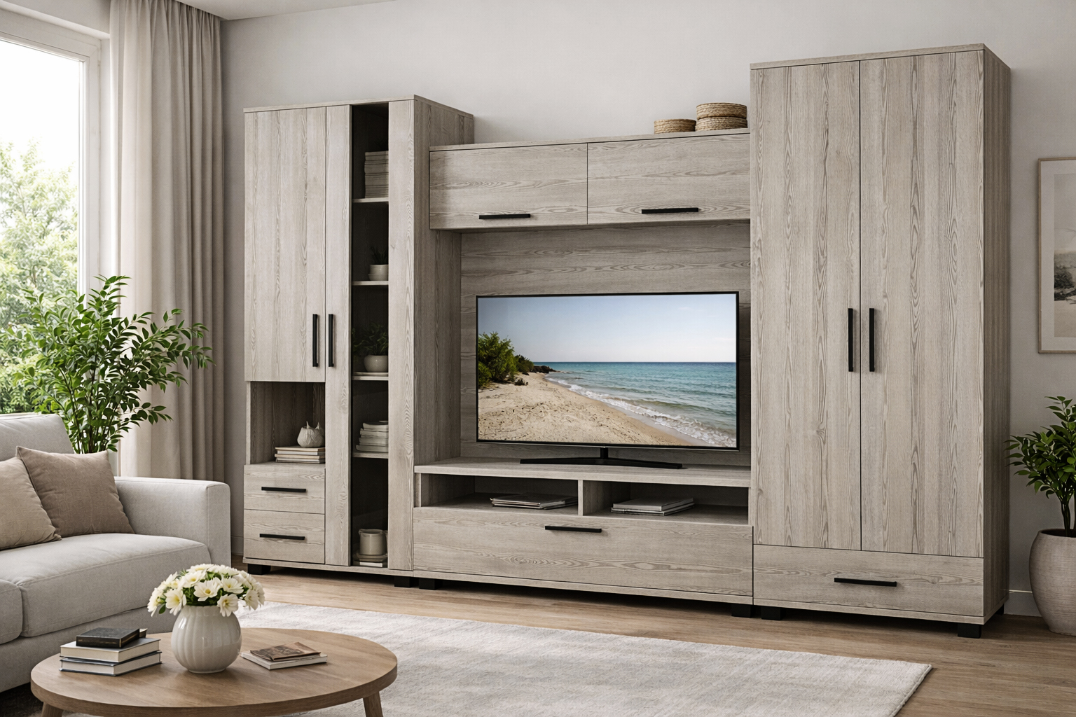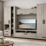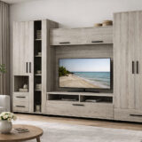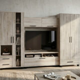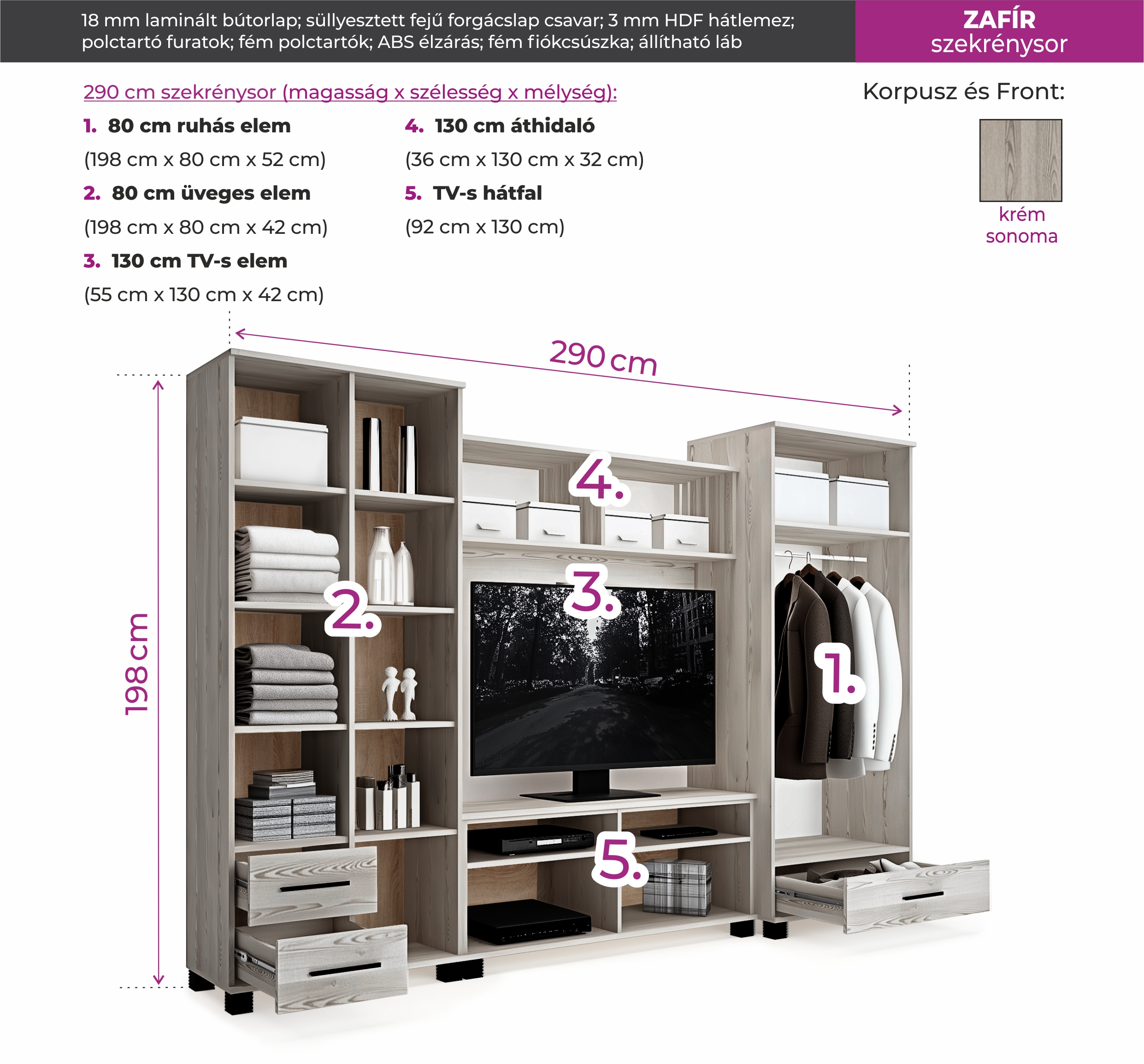 Kellemes színvilág, praktikus elrendezés. A Zafír szekrénysor 290 cm-es méretének köszönhetően akár a kisebb nappalikban is remekül mutat. A krém sonoma színt fekete fogók egészítik ki, amelyek a fekete füstüveg betéttel adják meg a termék karakterességét.